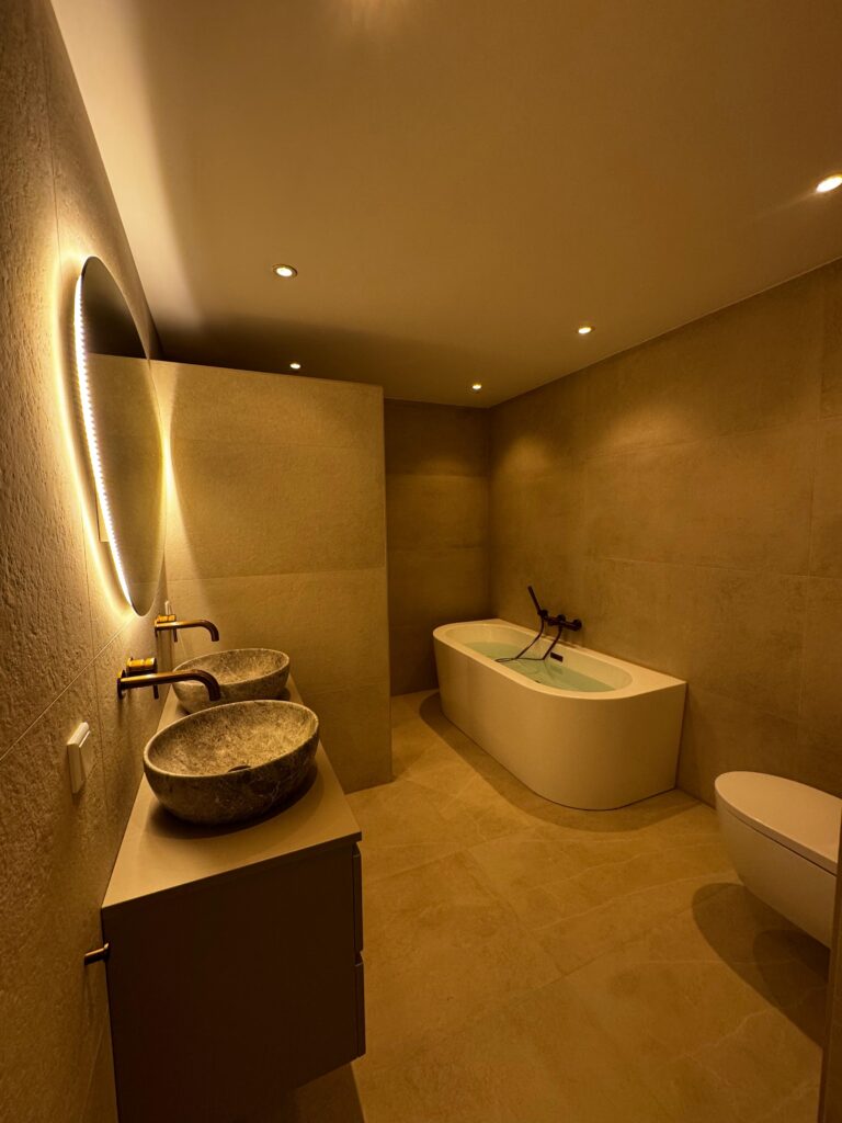 Vrijstaand bad, dubbele wastafels, vloerverwarming en slimme technologie. Een ultieme wellness-ervaring in je eigen huis.